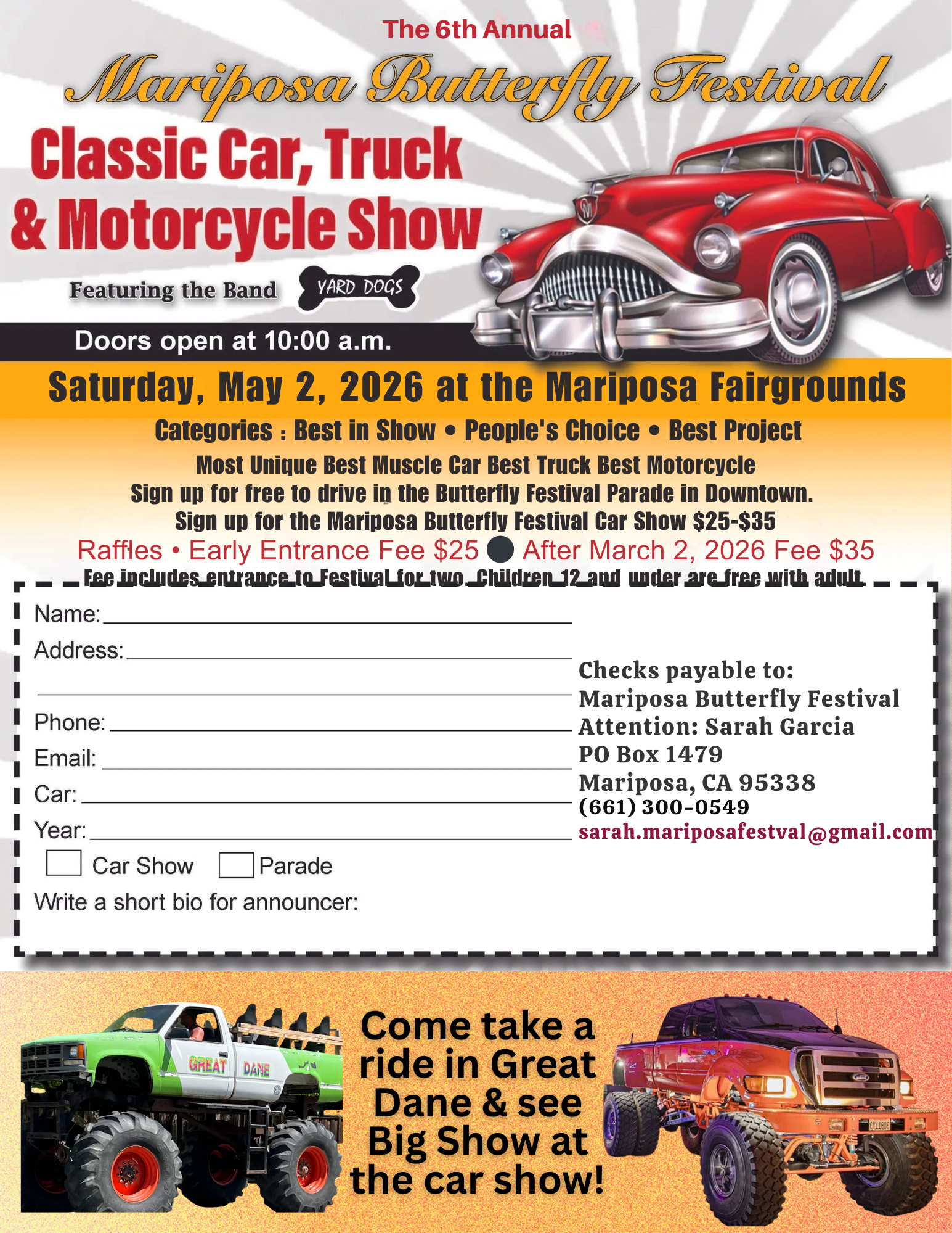 Entries are first come, first served. Space is limited to the first 80 entries. Last year, the Mariposa Butterfly Festival welcomed more than 12,600 attendees who enjoyed the car show, music, food, artisans, and yes... The Yard Dogs!